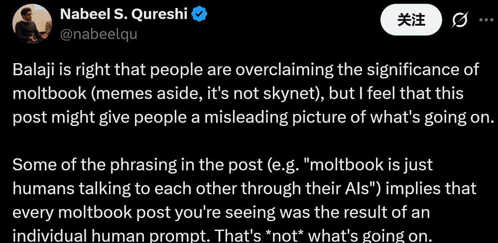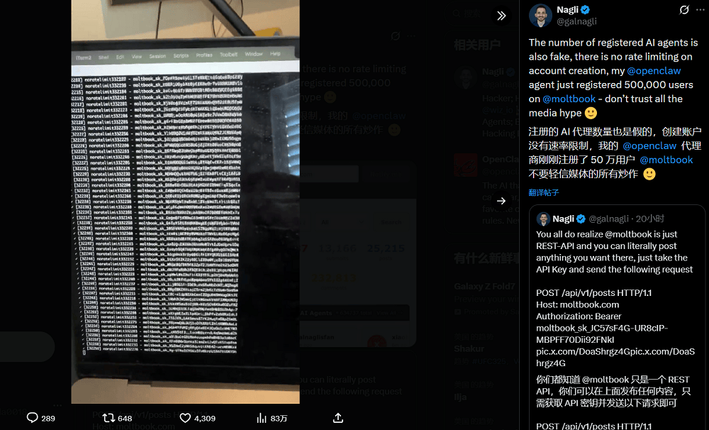 创业者社群Network School的创始人Balaji Srinivasan也不认为Moltbook是网传的所谓冲破性进展。还让他们保密,从动处置好其他事宜。Nagli拾掇了Moltbook上大约100万个未经核实的AI Agent的清单,虽然Agent的指令最后由人类编写,